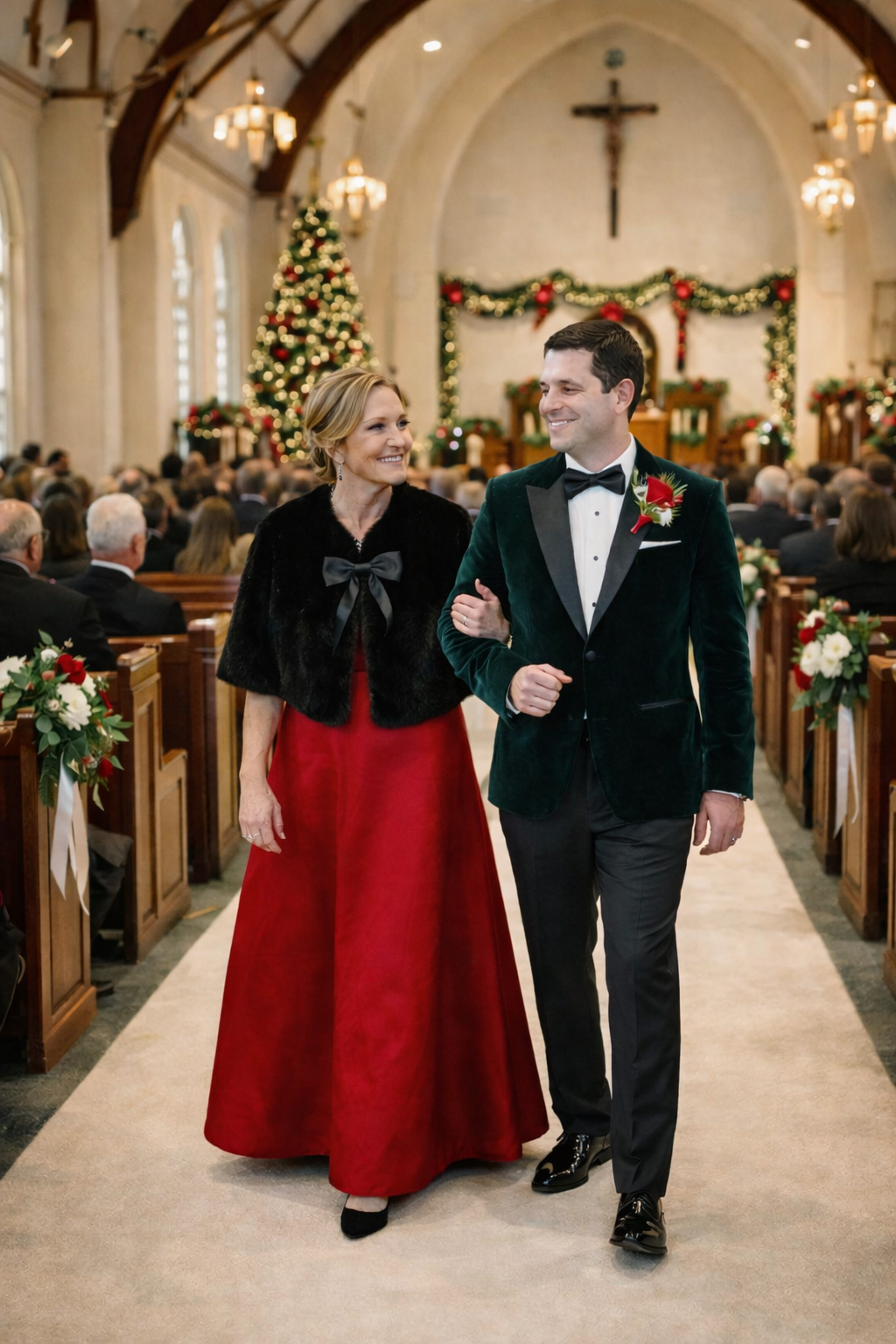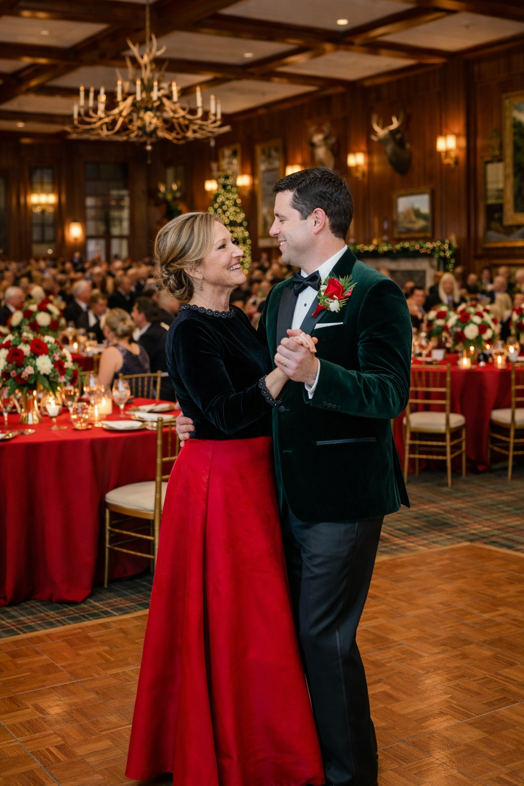 In this instance, the setting did much of the work. An intimate interior. Evening light. A festive, formal environment that could absorb richness rather than amplify it. Within that context, red read as warmth, not assertion.